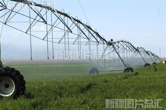 2004年8月16日,察布查尔锡自治县新建的优质草场正在进行喷灌。伊犁州在保护天然草场的同时,建设工人草场180万亩,改良草场587.92万亩,为发展畜牧业和改善生态环境奠定了坚实的基础。