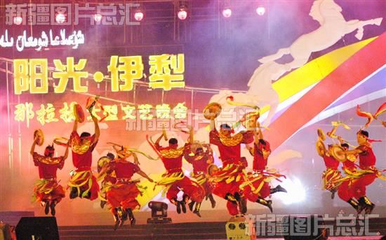 2004年9月6日晚,新源县人民广场变成歌舞的海洋,伊犁哈萨克自治州成立50周年“阳光·伊犁”大型广场晚会在这里举行。这是伊犁州歌舞团表演的热情奔放的锡伯族舞蹈“鼓舞”。