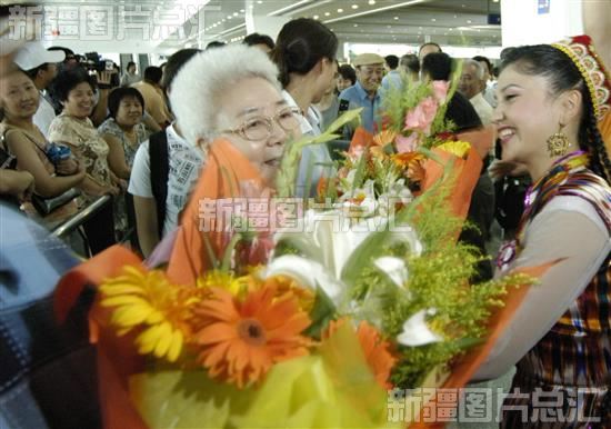 2004年,在“电影艺术家新疆行”活动中,著名电影表演艺术家田华(前左)等在乌鲁木齐国际机场受到各族群众热烈欢迎。