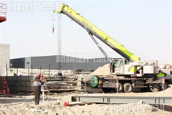 2023年11月27日,工人在位于库车经济技术开发区的新疆奥福化工有限公司项目施工现场吊装设备。