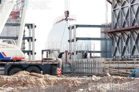 2023年11月27日,工人在位于库车经济技术开发区的新疆奥福化工有限公司项目施工现场吊装设备。