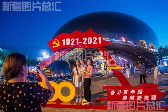 2021年7月9日,游客在位于克拉玛依一号井景区的庆祝中国共产党成立100周年主题雕塑前合影。