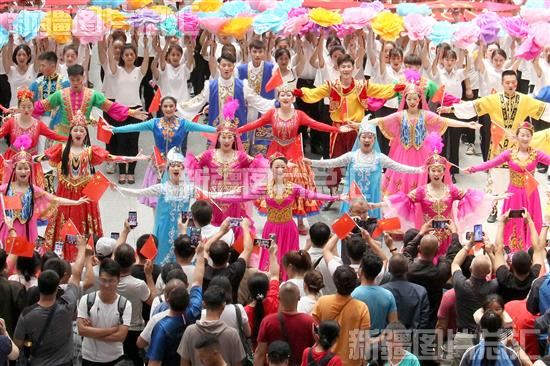 2019年8月28日,铁路职工、旅客、演员等在兰新高铁乌鲁木齐站《我和我的祖国》。
