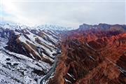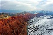 一场初雪,让昌吉百里丹霞风景道披上银装。11月13日,从昌吉市硫磺沟镇沿着 S101省道一路向西,从高处俯瞰丹霞,天山南北坡呈现截然不同的风光,雪落北坡,把层峦叠嶂的山脉装扮的如水墨丹青,而南坡有阳光普照,五彩斑斓丹霞尽显婀娜多姿神态,雪线勾勒出线条美,富有诗意,让百里丹霞呈现半山水墨半山诗的美丽画卷。
