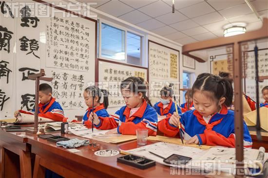 2023年11月17日,昌吉市第三小学书法社团的学生在练习毛笔字。