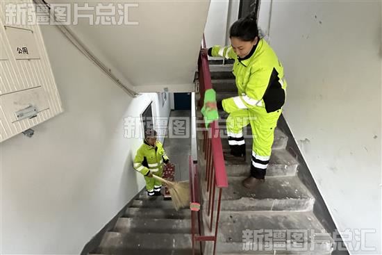 2023年11月23日,乌鲁木齐市沙依巴克区长江路街道棉南佳苑小区物业人员在楼道打扫卫生。