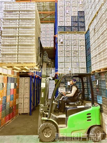 2023年11月23日,新疆鸿果农业科技发展有限责任公司员工驾驶叉车,将果品入冷库。