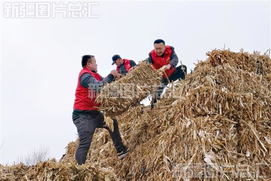 2023年11月22日,沙湾市东湾镇宽沟村驻村干部和党员志愿者帮助牧民搬运饲草料。