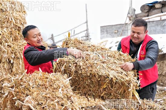 2023年11月22日,沙湾市东湾镇宽沟村驻村干部和党员志愿者帮助牧民搬运饲草料。