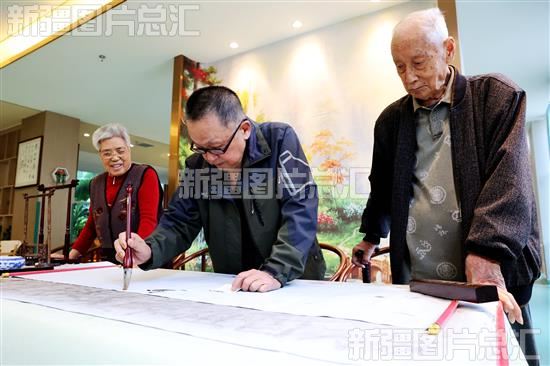 2023年11月27日,昌吉市厚德康养家园里,老人正在练习书法。