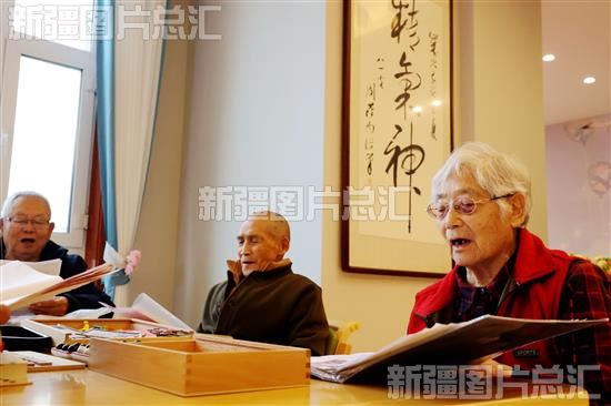 2023年11月27日,昌吉市厚德康养家园里,老人正在练歌。