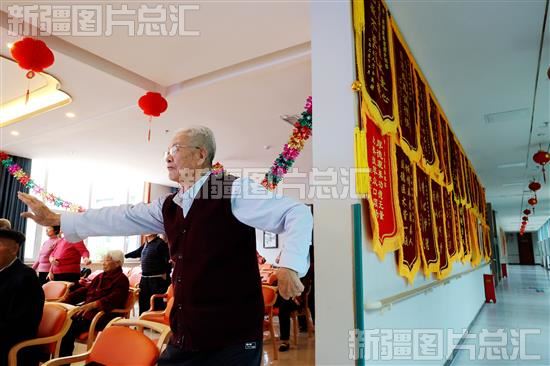 2023年11月27日,昌吉市厚德康养家园里,老人正在做太极保健操。