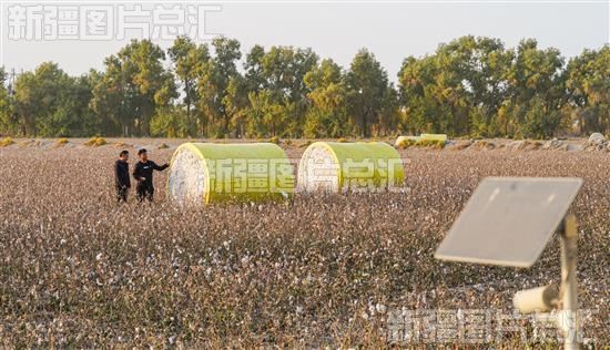 2023年10月28日,艾海鹏和凌磊查看棉花采收情况。