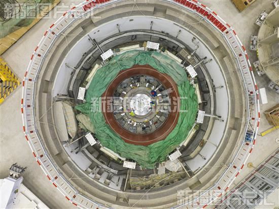 2023年12月11日,新疆维吾尔自治区昌吉回族自治州国家电网阜康抽水蓄能电站的地下厂房里,工作人员正在安装3号机组设备。