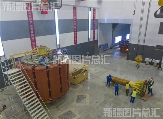 2023年12月11日,新疆维吾尔自治区昌吉回族自治州国家电网阜康抽水蓄能电站的地下厂房里,工作人员正在安装4号机组设备。