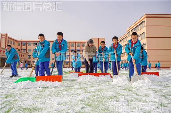 2023年12月11日,昌吉市第五小学的学生和老师一起扫雪。