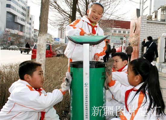 2008年3月12日,新疆塔城市第二小学的学生放学后在新华街为垃圾箱“洗脸”。进入3月份以来,塔城市积极组织市民开展清理白色垃圾、清洗垃圾箱等活动,文明新风吹遍该市的大街小巷。