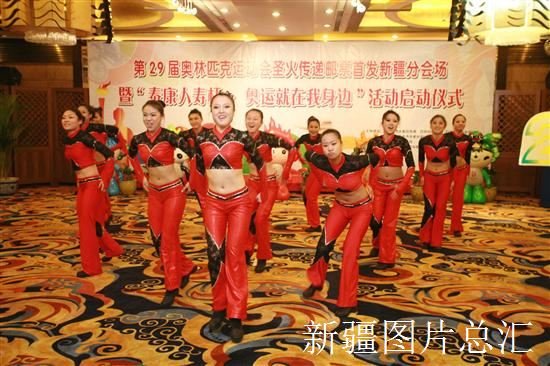 2008年3月26日,第29届奥林匹克运动会圣火传递邮票在新疆首发。 图为新疆奥运拉拉操队成立以来首次正式在舞台亮相。
