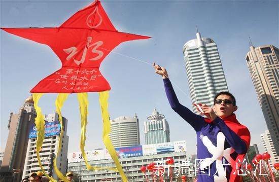 2008年3月22日是第十六届“世界水日”,也是第二十一届“中国水周”的第一天。当天,一名青年志愿者在乌鲁木齐人民广场放飞一只宣传“世界水日”的风筝,以此号召人们珍惜水资源、保护水资源。