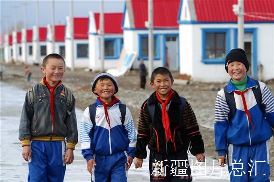 2008年3月21日,吉木乃县托普铁热克乡石油新村的几名哈萨克族小学生正高兴地去上学。这个新村是由中国石油天然气集团投资480万元为当地贫困农牧民建设的,已有356户1400多人入住,其中56户特困户和因病因残致贫户获得全额补助。