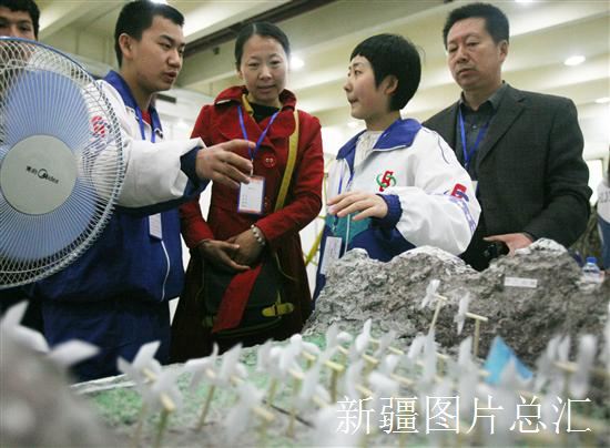 2008年3月29日,乌鲁木齐市第八中学的学生在为参观者介绍他们的风力发电科技创新作品。当天,为期3天的自治区青少年科技创新大赛在新疆国际博览中心拉开帷幕。全疆14个地、州、市的220个青少年科技竞赛项目参加了比赛。