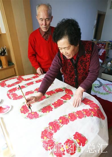 2008年3月26日,乌鲁木齐市郭竹娥老人家里在绘制牡丹图。为迎接即将到来的北京2008奥运会,老人精心绘制了46幅牡丹图并连成一体,每幅图上的牡丹花都嵌在奥运五环图内和“2008”等字样中,为奥运祝福。