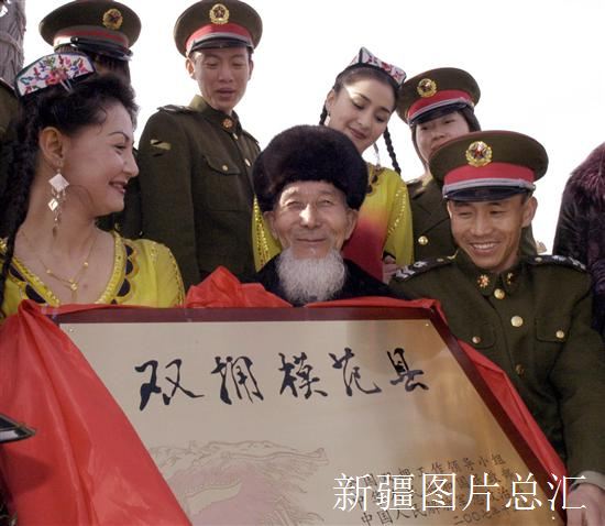 2008年3月3日,全国“爱国拥军模范”、库车县阿格乡兰干村村民卡德尔·巴克(中)手捧“全国双拥模范县”牌匾喜不自禁。当日,库车县召开荣获“全国双拥模范县”庆祝暨动员大会,表彰了该县31个双拥工作模范单位和个人。