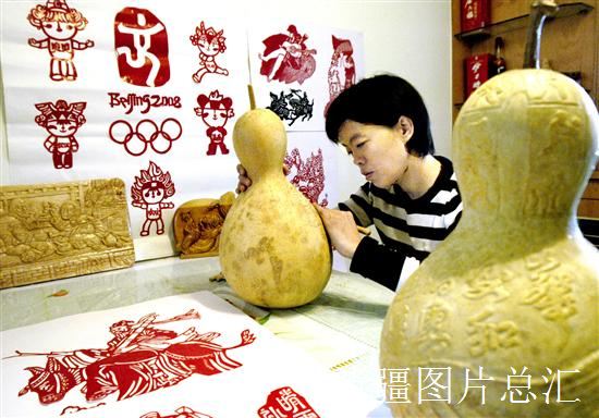 李素兰在葫芦上雕刻奥运福娃。李素兰是中国塔里木石油运输公司的一名职工,她根据奥运题材,在葫芦和鸡蛋壳上雕刻奥运福娃和其他体育竞技形象,以此来寄托石油工人对北京奥运的期盼和向往。