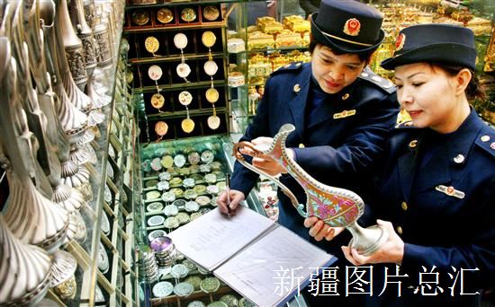 2008年3月14日,乌鲁木齐市天山区工商局二道桥工商所的执法人员在检查新疆国际大巴扎旅游纪念品市场。据了解,为使旅游纪念品市场得到规范化,当日,该所对辖区内旅游纪念品市场进行了专项突击检查,要求经营户对所销售物品标明进货产地、明码标价,不得蒙蔽消费者,规范市场经营秩序,保护消费者合法权益。