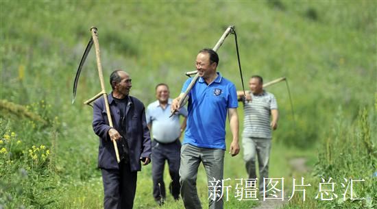 2003年7月21日,住阿尔斯郎村工作队队员居马哈孜(前右)等帮助当地牧民打牧草。