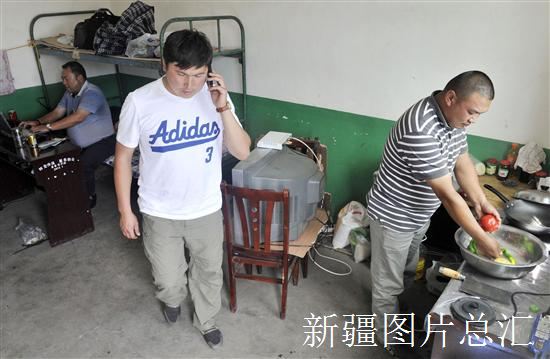 2003年7月20日,住阿尔斯郎村工作队队员在做午饭。工作队的食宿全部自己解决,不给所住村增添负担。