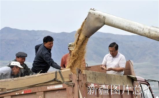 2003年7月22日,住赛普勒村工作队队员赛力克(左三)、阿孜来提(右)在帮助当地村民收小麦。