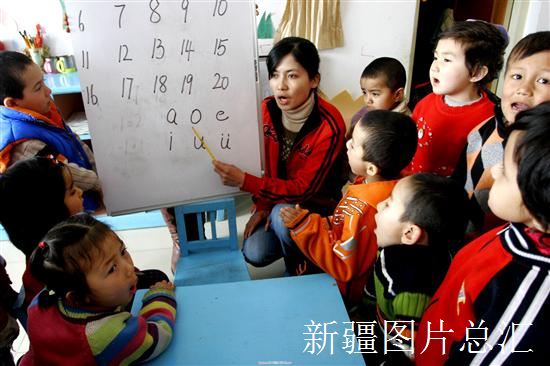 2008年3月22日,阿克苏市托普鲁克乡幼儿园“双语”教师在教少数民族儿童学习汉语拼音。目前阿克苏市送子女到汉语学校和“双语”学校学习的家长越来越多。