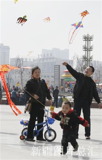 2008年3月22日,市民高先生一家在乌鲁木齐市南湖市民广场放风筝。当天,乌鲁木齐阳光明媚、春意盎然,人们纷纷走出家门,感受春天的气息。