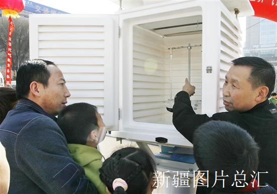 2008年3月23日,气象工作人员艾尔登(右)在百叶箱前向市民介绍天气预报温度数据来历。当天是“世界气象日”,为了让市民更多了解气象知识,自治区气象局在乌鲁木齐人民广场举行了大型宣传活动。