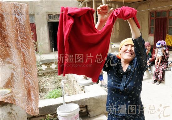 4 月22 日,莎车县阿斯兰巴格乡农民阿依夏木在院里晾晒衣服,她说:“家里去年通了自来水,做饭洗衣服都很方便。”