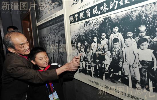 2013年9月27日,在乌鲁木齐燕儿窝革命烈士陵园烈士事迹陈列馆,程源敏(右)在一张出狱后回到延安时拍摄的纪念照里,寻找到自己的影像。