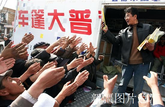 2008年3月27日,自治区科学技术学会工作人员在给农牧民免费发放科技图书。当天,自治区“三下乡”服务示范团科技分团在伊宁县开展了服务活动。据了解,这次科技分团在伊犁哈萨克自治州直属县市给农牧民共发放了2万多册的科技图书。