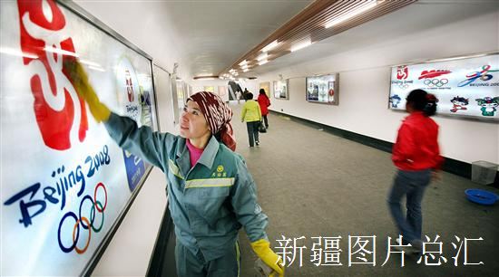2008年4月9日,一名环卫工人在乌鲁木齐市中山路地下通道擦洗墙面上的奥运宣传栏。随着北京奥运会的临近,首府主要街道及地下通道布置的各类奥运宣传画,新颖独特,成为首府新的亮点。