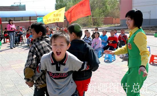 2008年4月12日,哈密阶梯英语学校与哈密特殊教育学校的师生在做游戏。当天,两家学校开展"传递爱心 ,播洒希望"手拉手联谊活动,通过结对子、共同表演节目、赠送学习用具等形式,为残疾学生带去欢乐和温暖。