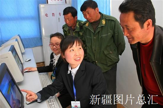 2008年4月16日,巴里坤石人子乡远程教育工作人员正在为农民查询信息。 当天,哈密“农村党员干部现代远程教育学用活动经验交流会”在巴里坤县召开。