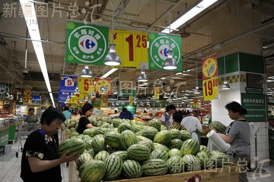 6月21日,在乌鲁木齐家乐福超市南湖店“农超对接”专柜,顾客在购买西瓜