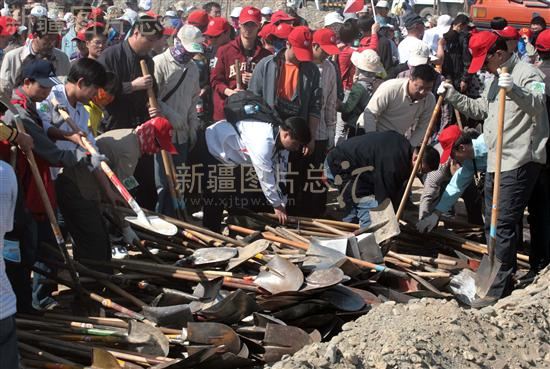 2011年4月16日,乌鲁木齐市达坂城区达东路南戈壁迎来了绵延一公里的车队。40辆大巴、近20辆自驾车,带来了3000多名在此义务植树的市民。