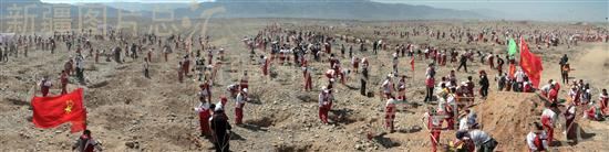 2011年4月16日,乌鲁木齐市达坂城区达东路南戈壁迎来了绵延一公里的车队。40辆大巴、近20辆自驾车,带来了3000多名在此义务植树的市民。