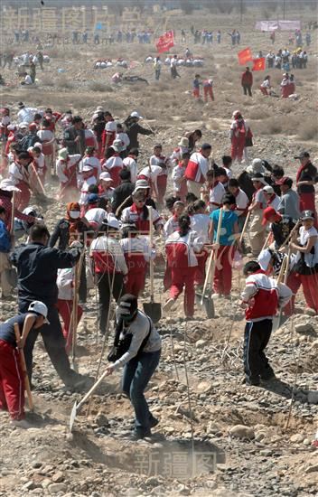 2011年4月16日,乌鲁木齐市达坂城区达东路南戈壁迎来了绵延一公里的车队。40辆大巴、近20辆自驾车,带来了3000多名在此义务植树的市民。