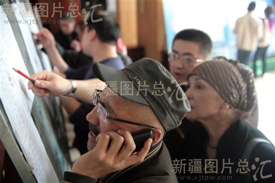 4月14日,廉租房选房认租现场,市民阿不都那斯尔·阿不力米提(前)用手机跟家人商量认租房屋的面积和楼层。