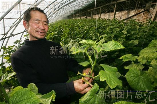 2012年2月2日,新疆伊犁哈萨克自治州尼勒克县尼勒克镇多尔布津村村民陈明兴在温室大棚里查看黄瓜生长情况。该村200多户村民在尼勒克镇长丰蔬菜种植专业合作社的帮助下种植了绿色无公害蔬菜。陈明兴种植的黄瓜通过合作社销售到了中亚市场,今年预计能有4万元的收入。