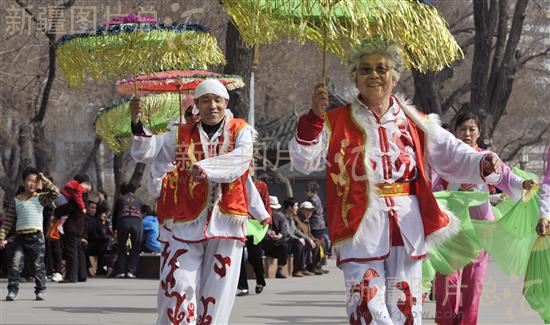 2012年4月7日,市民在乌鲁木齐市人民公园扭起秧歌。
