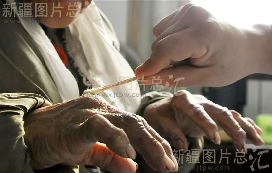 2011年1月4日,乌鲁木齐市救助站的工作人员在为被救助人员涂抹冻疮膏。连日来,乌鲁木齐市民政、行政执法、卫生、公安等部门组成工作队,上街对生活无着落人员进行救助,市救助站准备了100多套棉衣棉裤棉鞋和300多个床位帮助他们度过严寒。