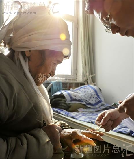2011年1月4日,乌鲁木齐市救助站的工作人员在为被救助人员涂抹冻疮膏。连日来,乌鲁木齐市民政、行政执法、卫生、公安等部门组成工作队,上街对生活无着落人员进行救助,市救助站准备了100多套棉衣棉裤棉鞋和300多个床位帮助他们度过严寒。